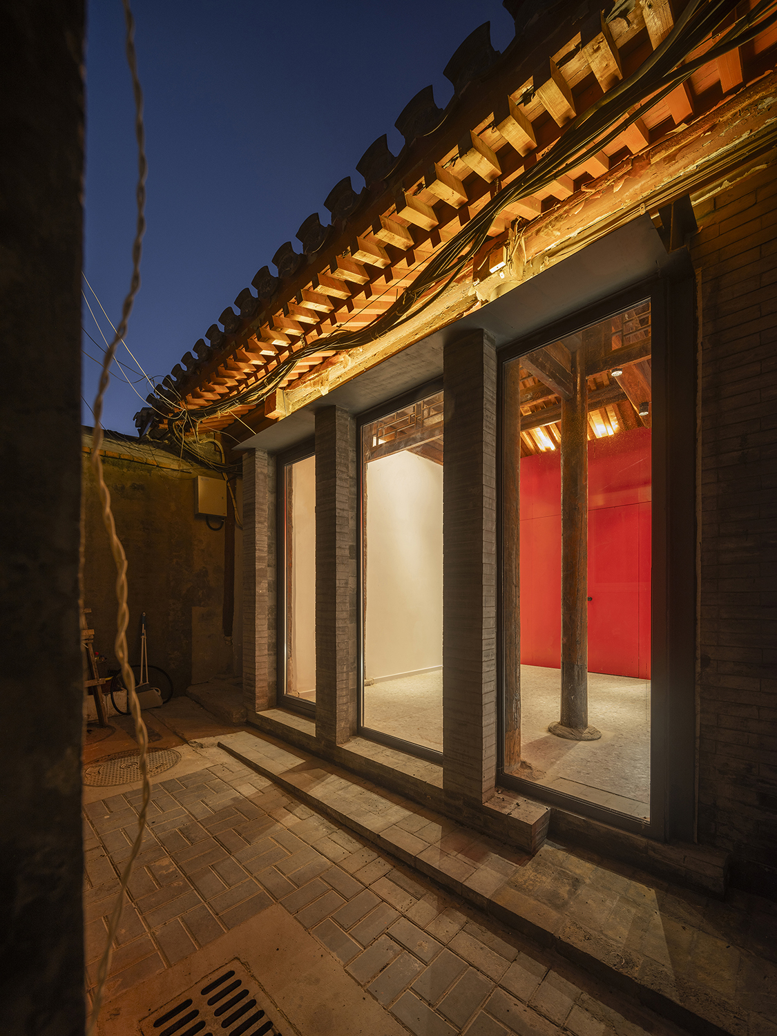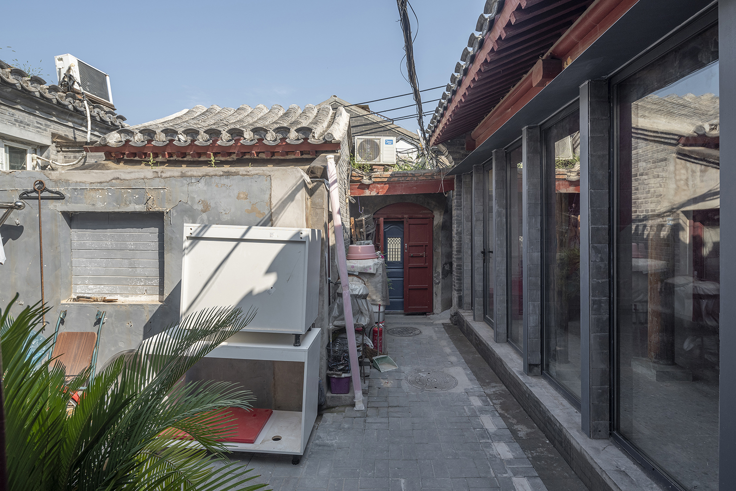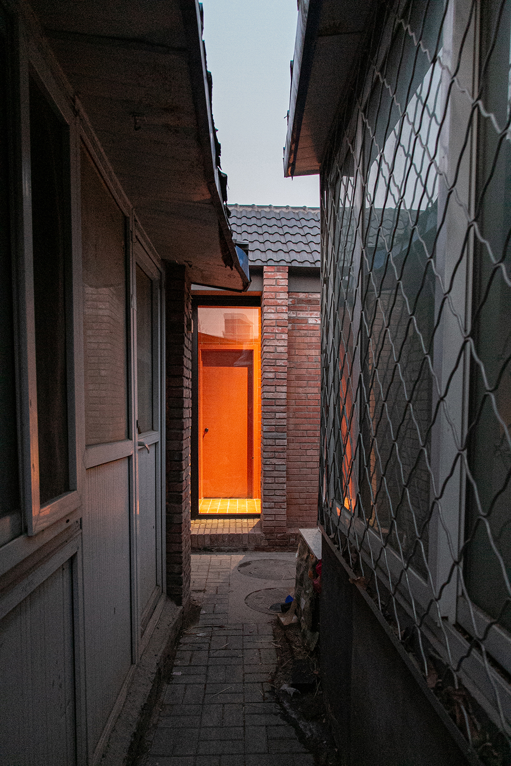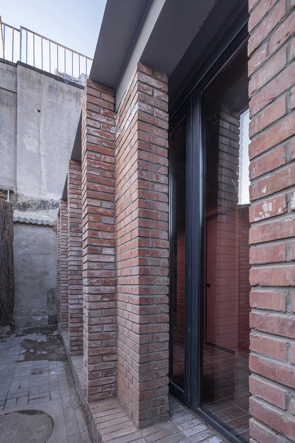 In the Tianqiao Bungalow zone, every building is uniqueness. On the premise of respecting the regulations and set principles, we propose that the way of architectural renewal is: the design should adapt to the varying conditions from house to house and from material to material. A thorough investigation and evaluation of each house is a prerequisite for renovation. The "narrow, small, low and dense" architectural space of Tianqiao's bungalow zone is not a shortcoming but an unique spatial characteristics of Tianqiao. Therefore, millimeter-scale construction and design have become the norm in daily work. Re-elevating the site to retain an old stone paving on-site became the norm. Renovations are carried out in units of "jian", taking three-jian brick houses as an example, which means that in most cases, when one or two of the jians being renovated, there are still residents living in the other jians. With limited funds, it is difficult to renovate the whole roof covering the three jians. Thus the old house was first partially repaired, and then the new architecture was inserted into the site on a minimal scale. New architectures usually look like a few floor-to-ceiling windows which are actually very small architectures compressed into the width of a wall. Therefore, this wall actually has two different facades. The south facade is made of brick and glass, and the north facade is made of steel and glass. Despite this, it provides all the basic functions of modern life, such as: water supply, electricity, heating and air conditioning, etc. It has an independent foundation and modern infrastructure, making it possible to live comfortably in a centuries-old house without having to change their modern lifestyle.