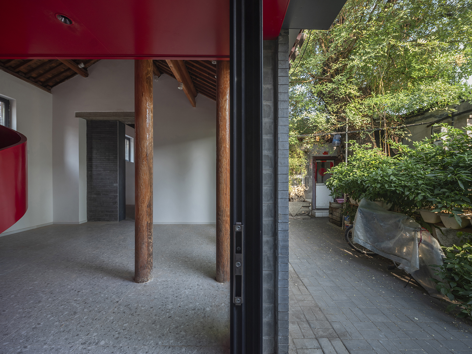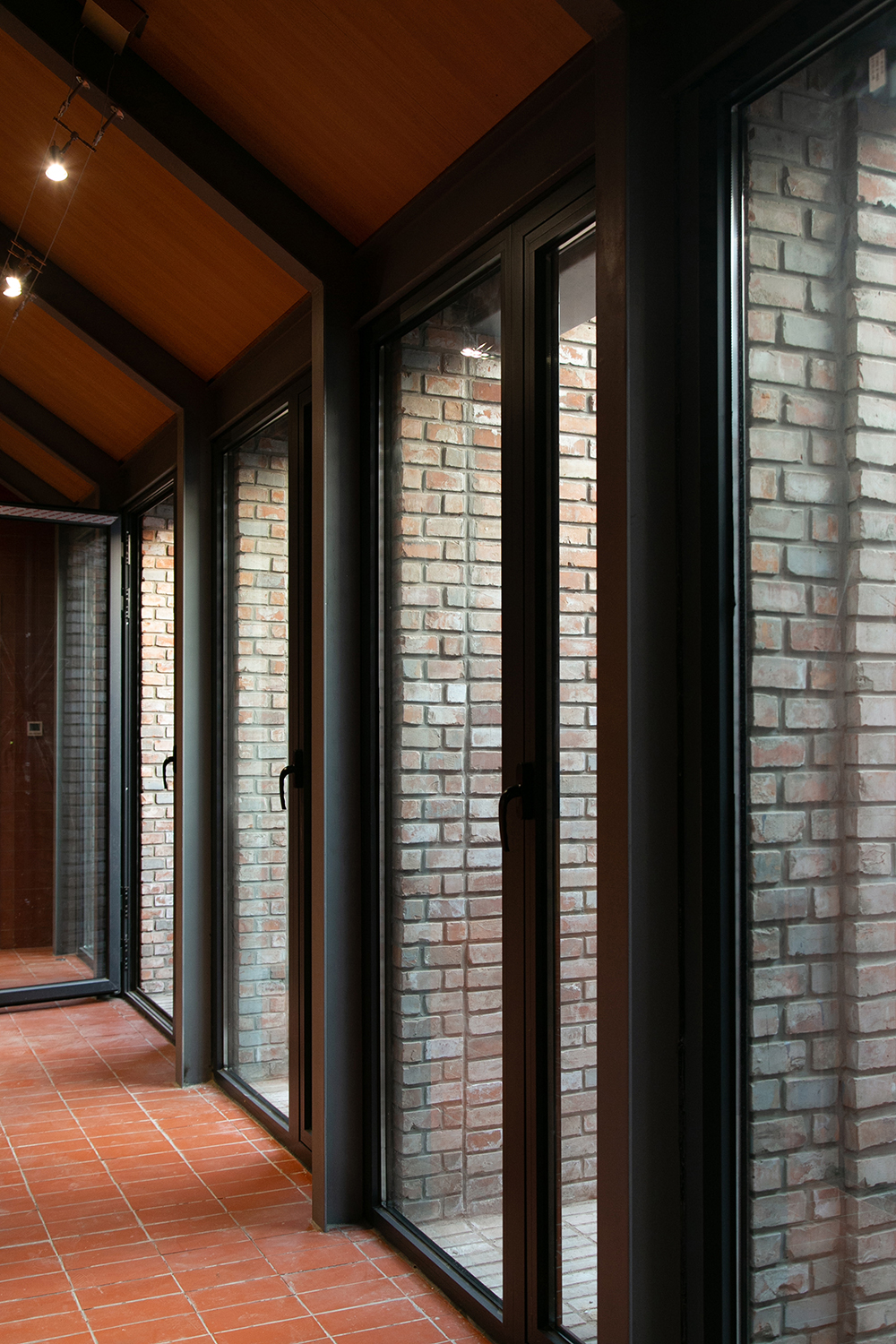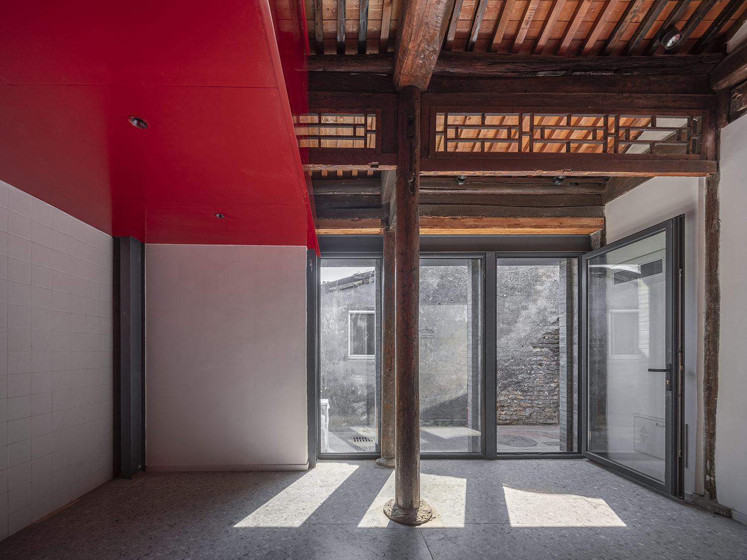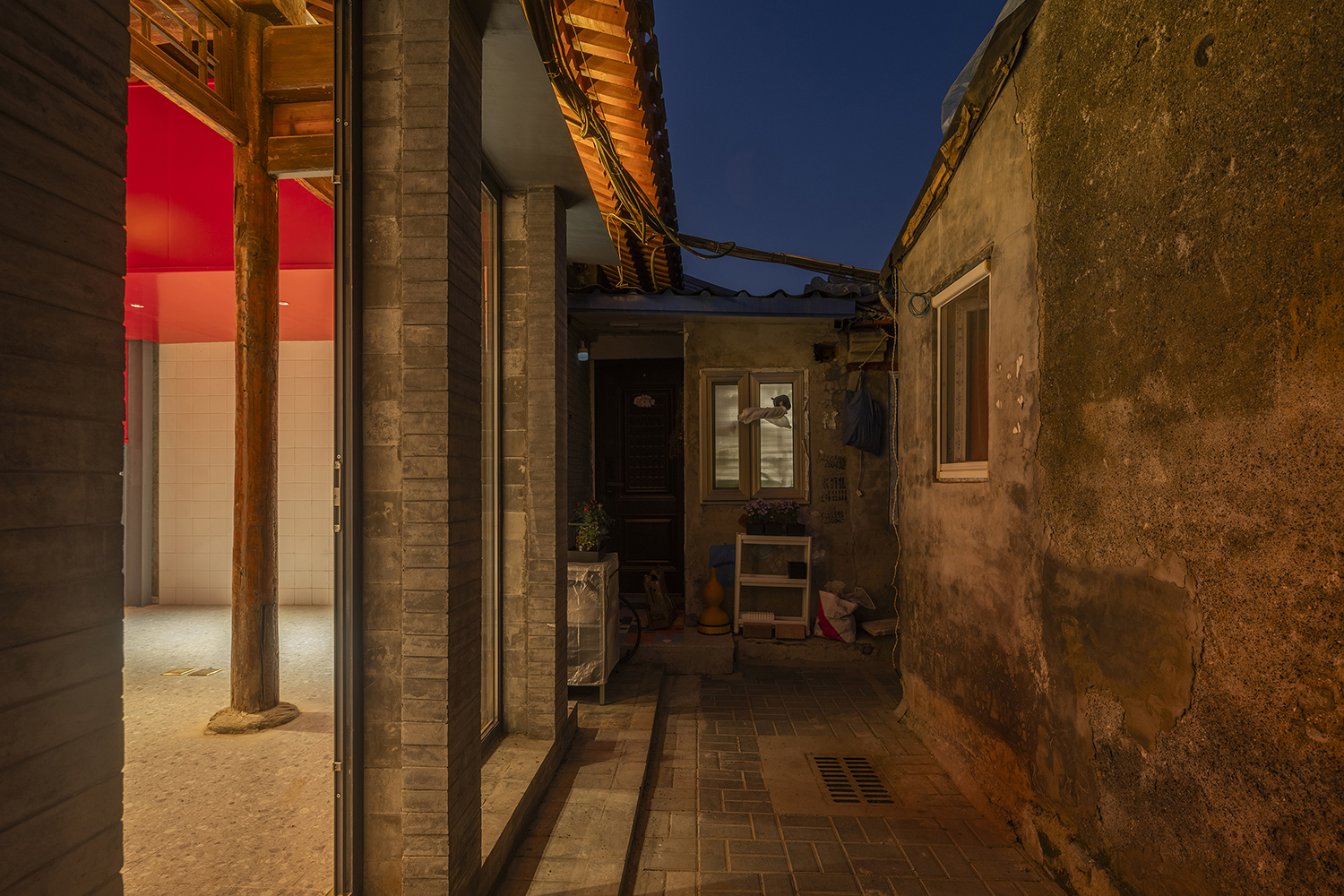 In the Tianqiao Bungalow zone, every building is uniqueness. On the premise of respecting the regulations and set principles, we propose that the way of architectural renewal is: the design should adapt to the varying conditions from house to house and from material to material. A thorough investigation and evaluation of each house is a prerequisite for renovation. The "narrow, small, low and dense" architectural space of Tianqiao's bungalow zone is not a shortcoming but an unique spatial characteristics of Tianqiao. Therefore, millimeter-scale construction and design have become the norm in daily work. Re-elevating the site to retain an old stone paving on-site became the norm. Renovations are carried out in units of "jian", taking three-jian brick houses as an example, which means that in most cases, when one or two of the jians being renovated, there are still residents living in the other jians. With limited funds, it is difficult to renovate the whole roof covering the three jians. Thus the old house was first partially repaired, and then the new architecture was inserted into the site on a minimal scale. New architectures usually look like a few floor-to-ceiling windows which are actually very small architectures compressed into the width of a wall. Therefore, this wall actually has two different facades. The south facade is made of brick and glass, and the north facade is made of steel and glass. Despite this, it provides all the basic functions of modern life, such as: water supply, electricity, heating and air conditioning, etc. It has an independent foundation and modern infrastructure, making it possible to live comfortably in a centuries-old house without having to change their modern lifestyle.