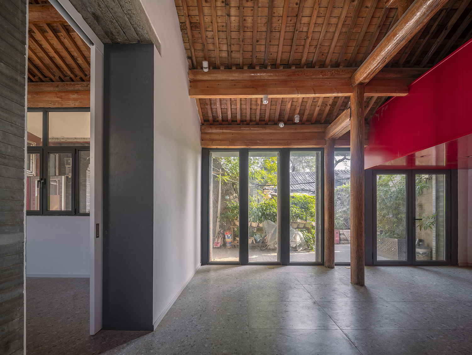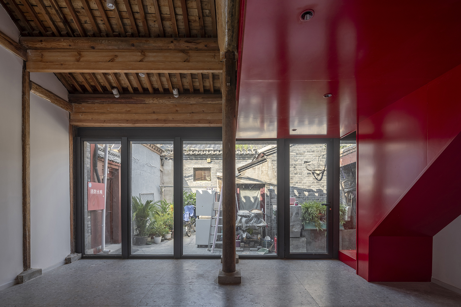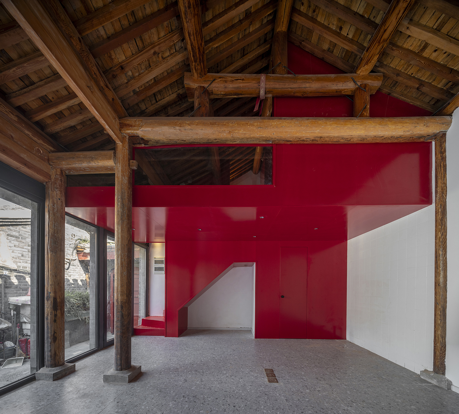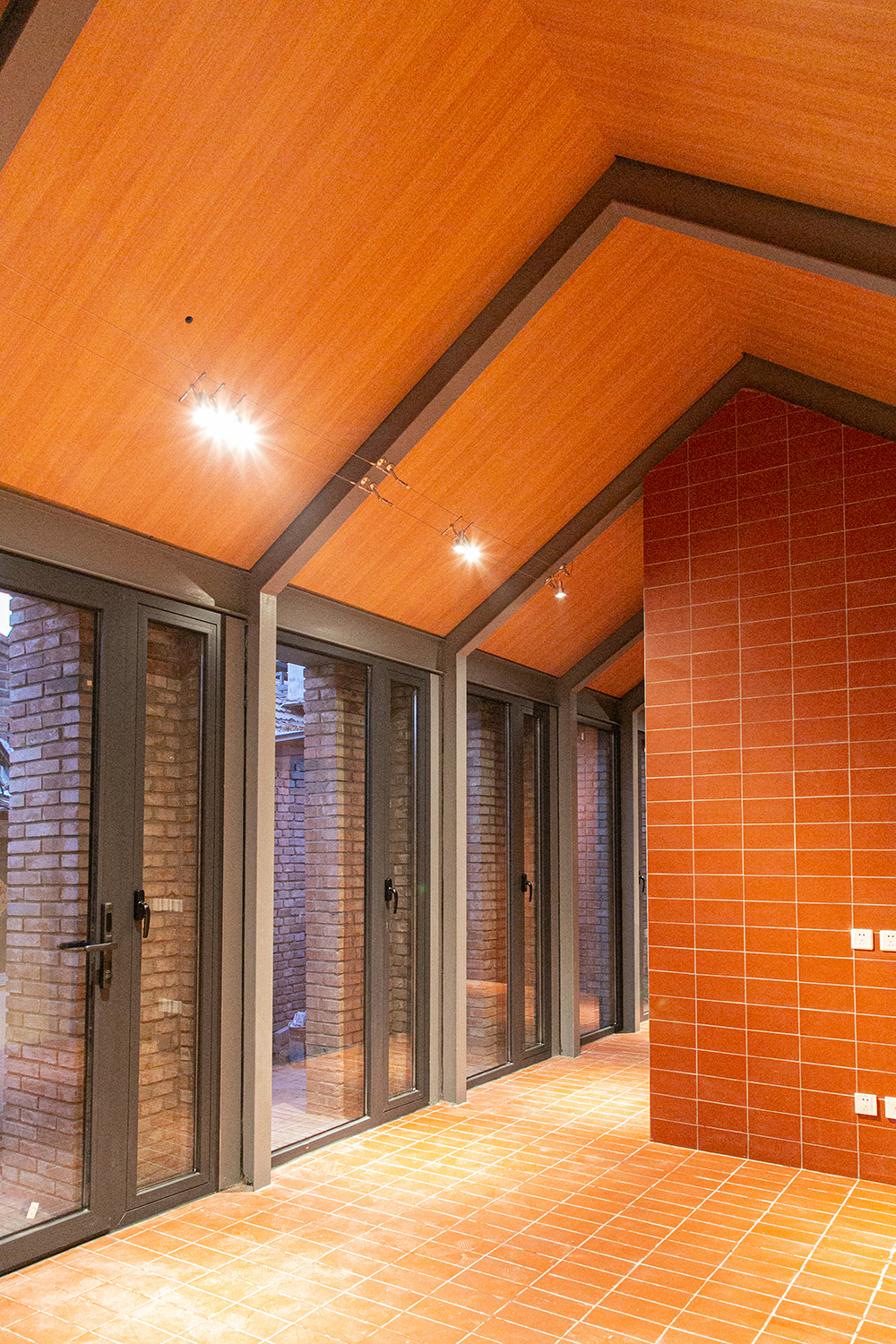 In the Tianqiao Bungalow zone, every building is uniqueness. On the premise of respecting the regulations and set principles, we propose that the way of architectural renewal is: the design should adapt to the varying conditions from house to house and from material to material. A thorough investigation and evaluation of each house is a prerequisite for renovation. The "narrow, small, low and dense" architectural space of Tianqiao's bungalow zone is not a shortcoming but an unique spatial characteristics of Tianqiao. Therefore, millimeter-scale construction and design have become the norm in daily work. Re-elevating the site to retain an old stone paving on-site became the norm. Renovations are carried out in units of "jian", taking three-jian brick houses as an example, which means that in most cases, when one or two of the jians being renovated, there are still residents living in the other jians. With limited funds, it is difficult to renovate the whole roof covering the three jians. Thus the old house was first partially repaired, and then the new architecture was inserted into the site on a minimal scale. New architectures usually look like a few floor-to-ceiling windows which are actually very small architectures compressed into the width of a wall. Therefore, this wall actually has two different facades. The south facade is made of brick and glass, and the north facade is made of steel and glass. Despite this, it provides all the basic functions of modern life, such as: water supply, electricity, heating and air conditioning, etc. It has an independent foundation and modern infrastructure, making it possible to live comfortably in a centuries-old house without having to change their modern lifestyle.