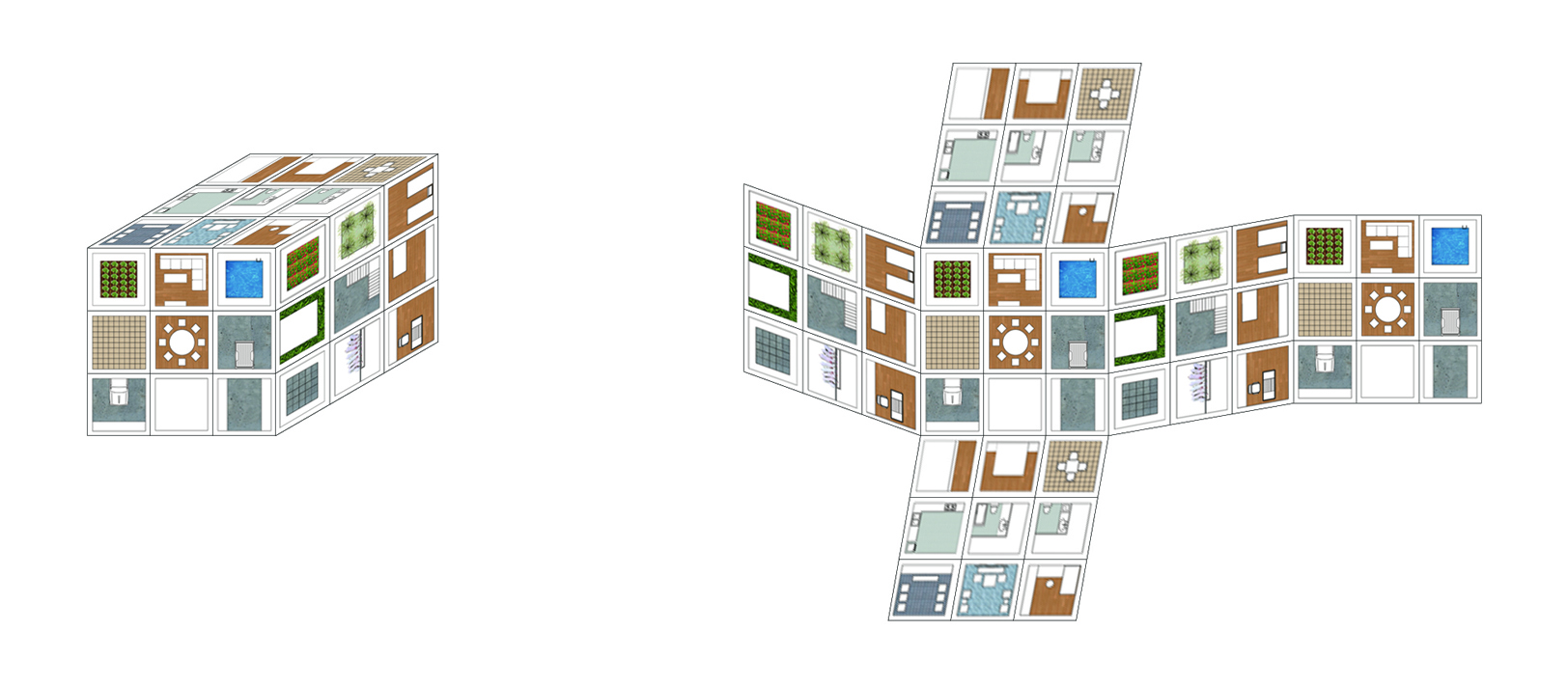 We quoted the concept of "magic cube" and rotated and collaged small cubes with different functions to obtain flexibility in plane and space. Starting from the land use, they established a grid system with 3.3 meters by 3.3 meters as a basic spatial unit. The size of all residential land is 3 x 7 squares, and the cost of one "square" is controlled at about 7,000 yuan. Farmers can choose how many squares of houses to build according to the subsidies received, their own financial resources and the relevant regulations on homesteads. As for the internal layout, farmers can arrange the functions of these blocks according to their own needs to form a layout, and the building can be established in structure.