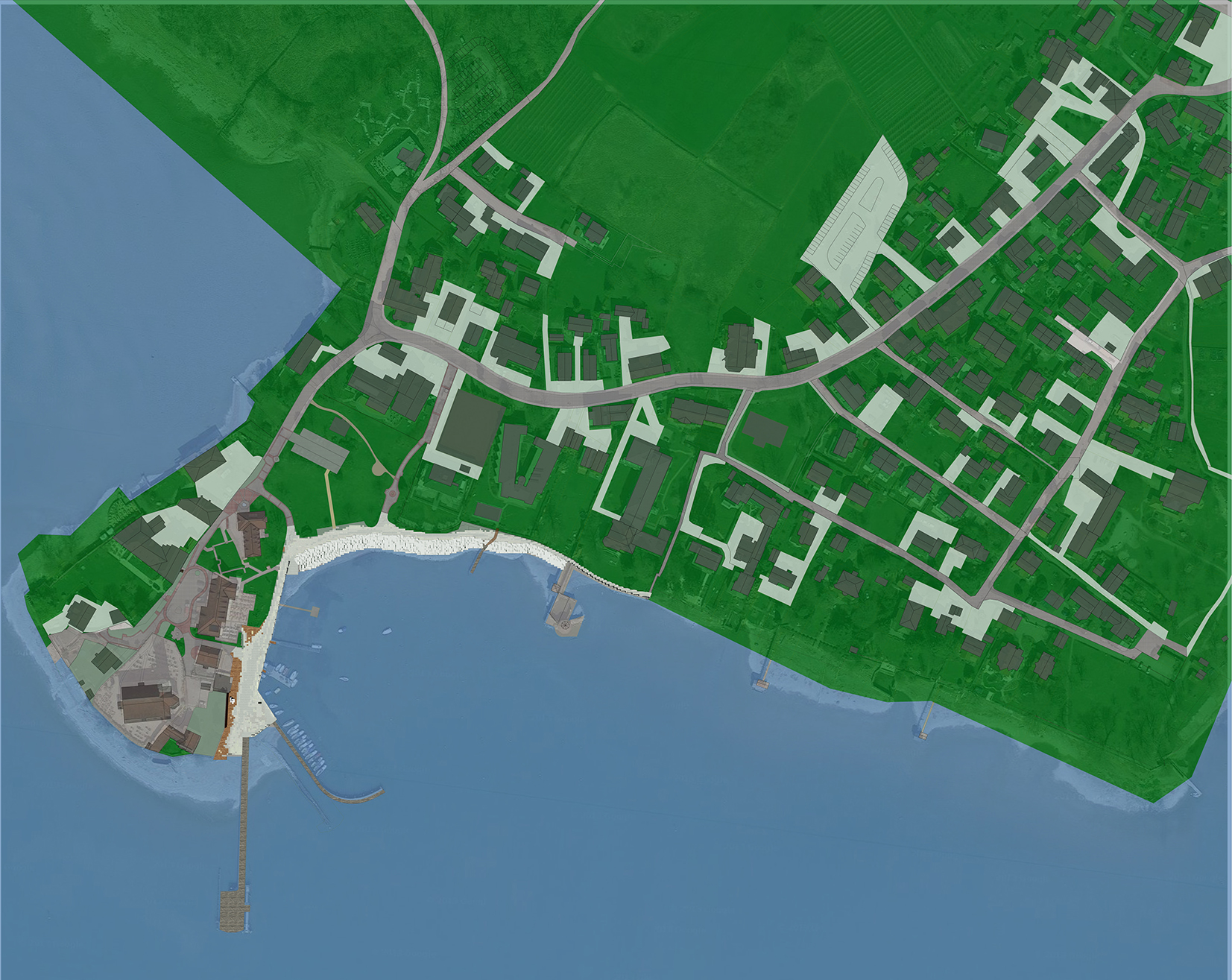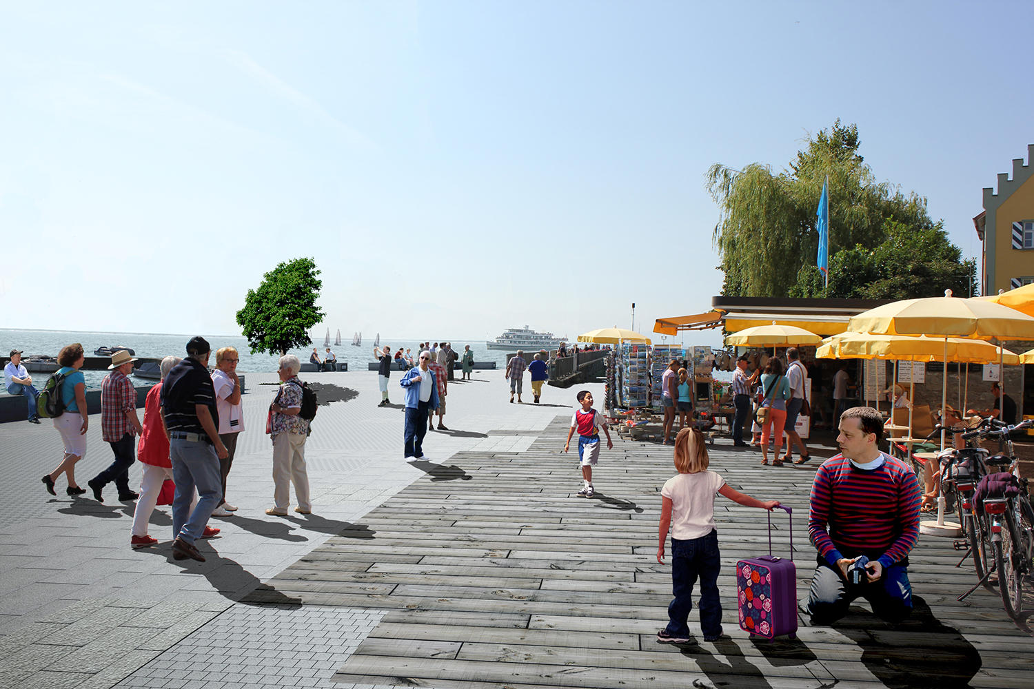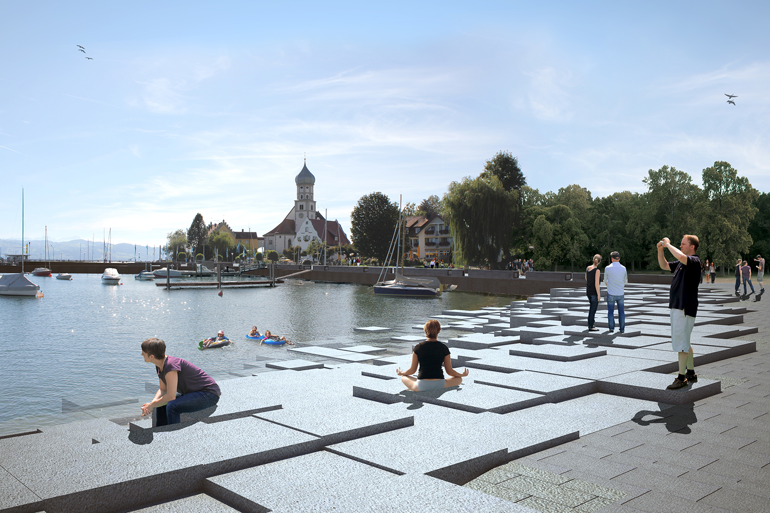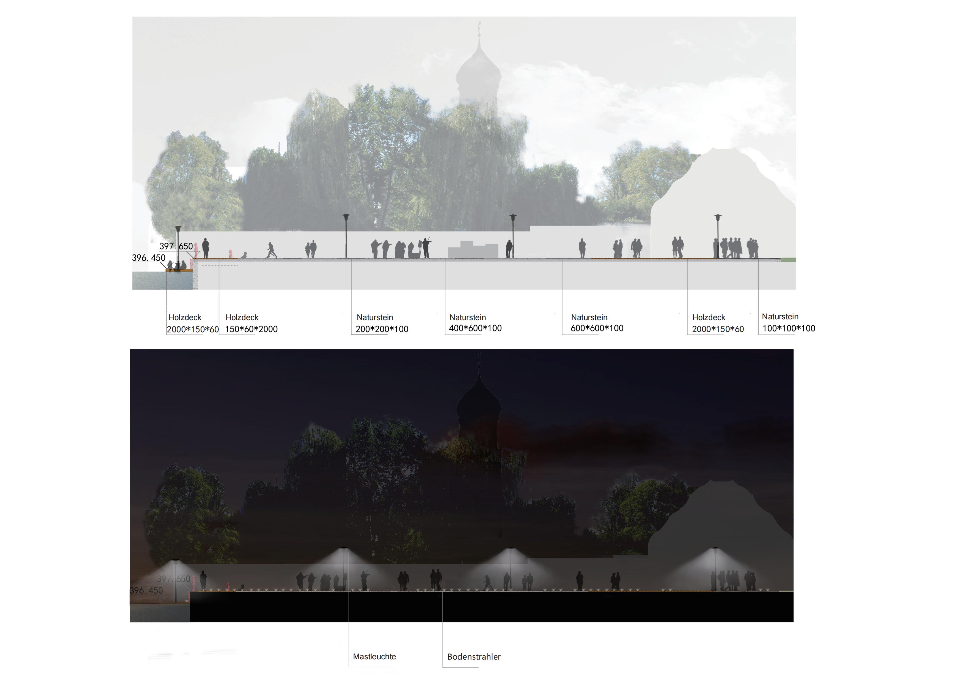 The transformation of Wasserburg's waterfront space will directly improve the quality of life for local residents and tourists in the city's shared open space. The harbor area, located in the southwest corner of the city, is not only an important urban dock area close to Lake Constance, but also a dense area of public buildings and historical buildings. In the strip of open space close to the lake, different groups of people share this space. How to make different users get a more comfortable and high-quality spatial environment in a shared open space has become the starting point of this design.