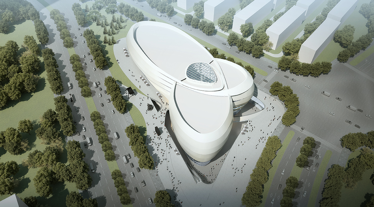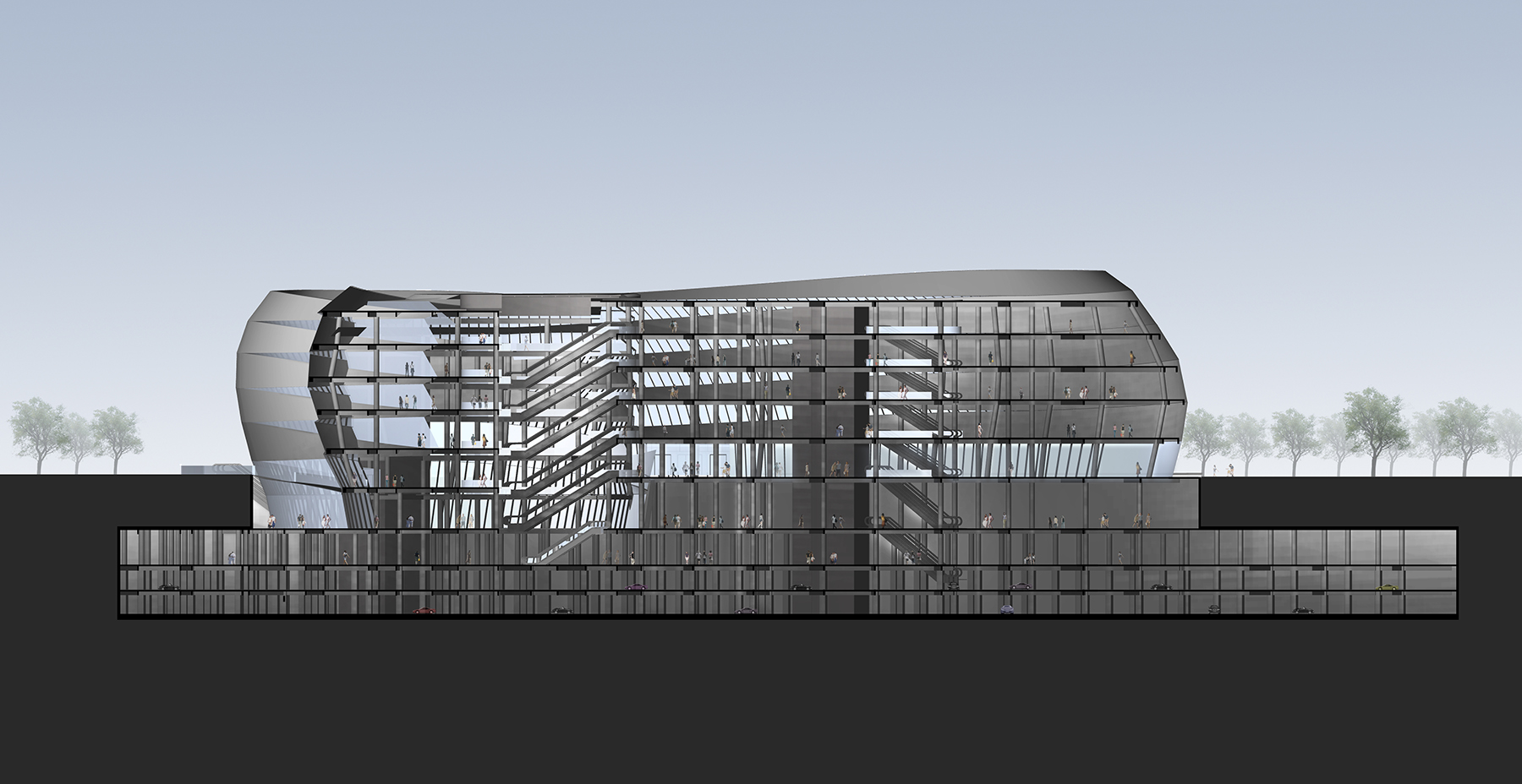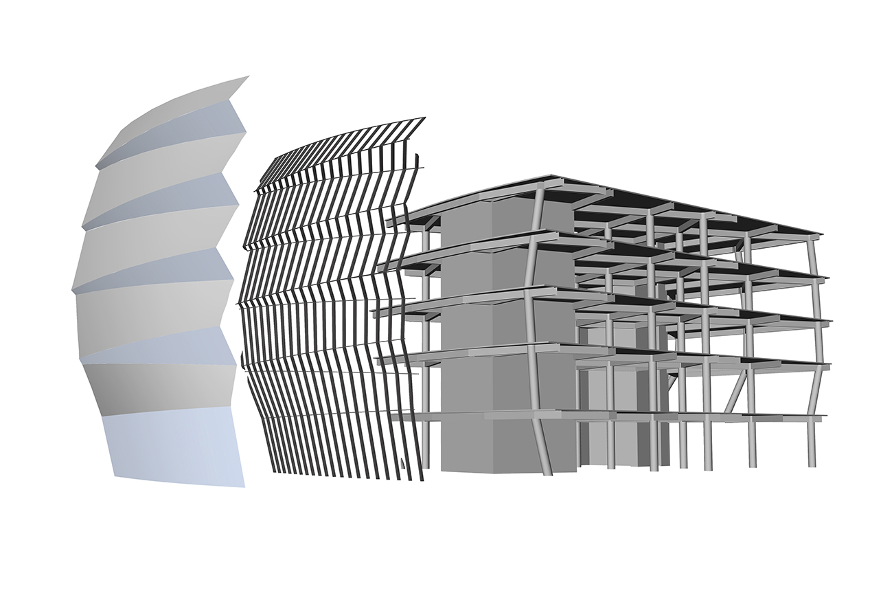 结构体系: 采用经济,便利的钢筋混凝土剪力墙体系。外周边柱根据建筑外皮曲面斜向布置,给建筑内部使用功能提供了灵活的布置空间,完美地将建筑的结构力学与建筑的空间使用相结合。
