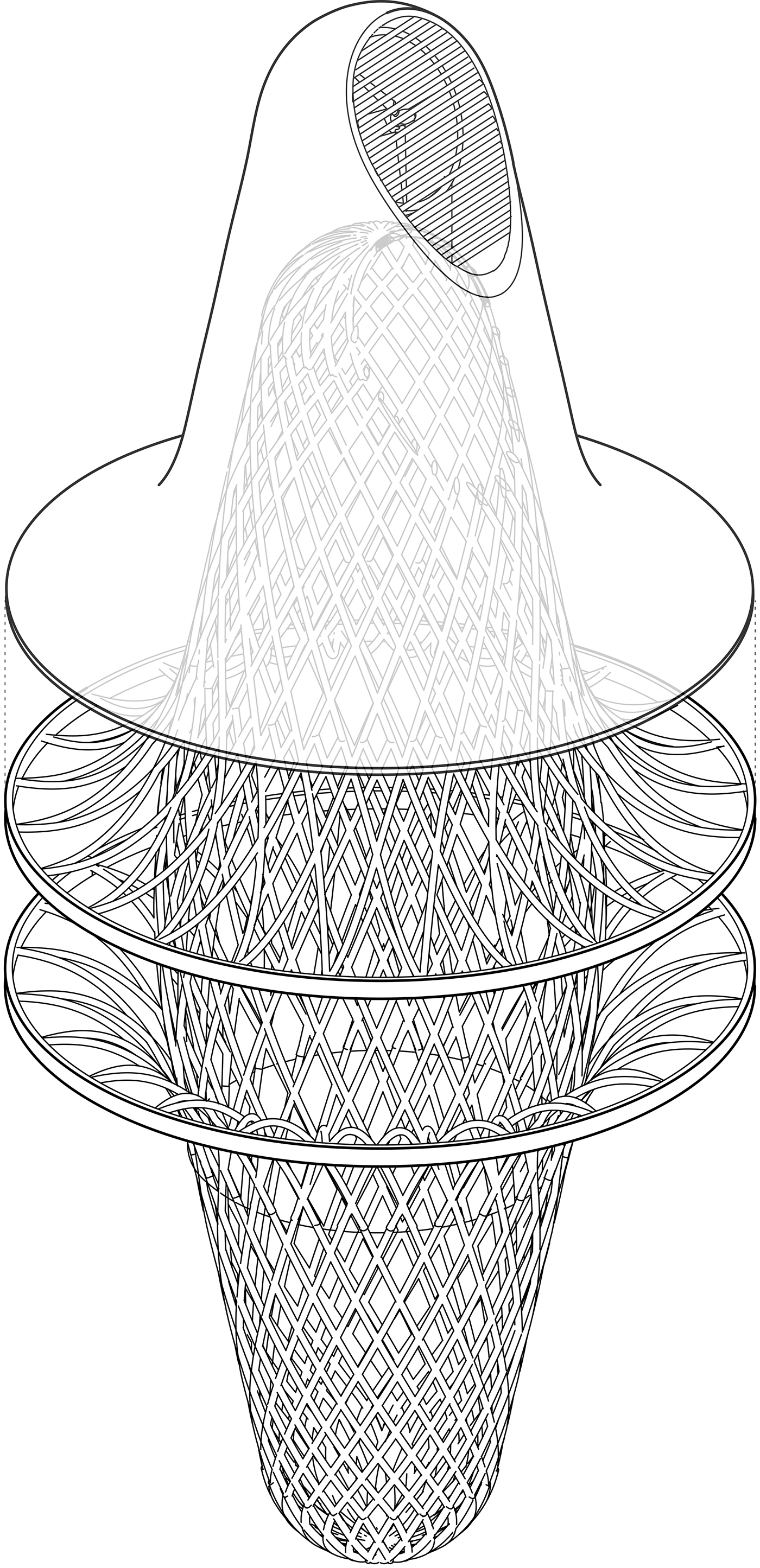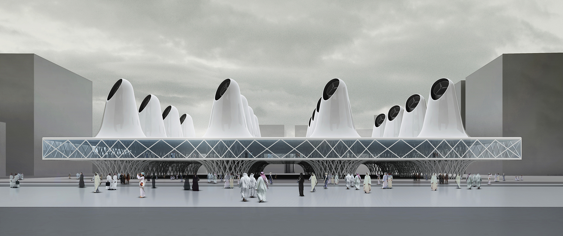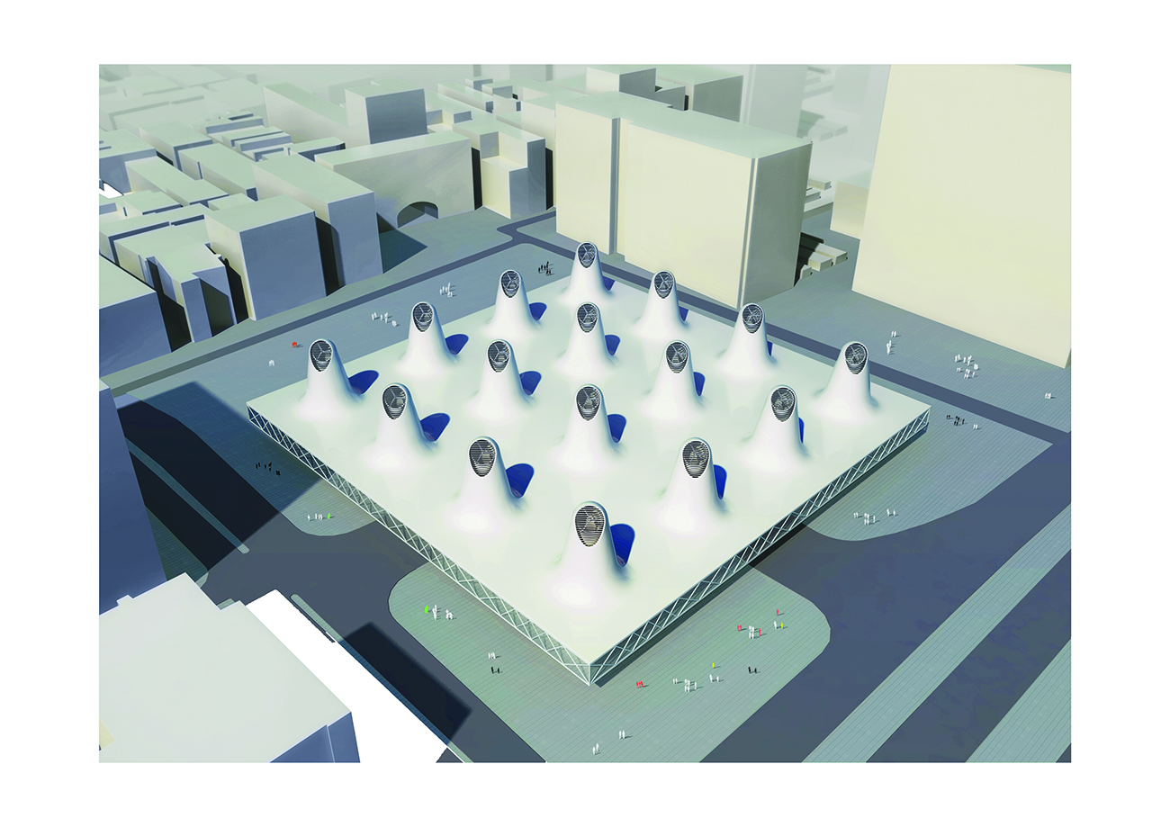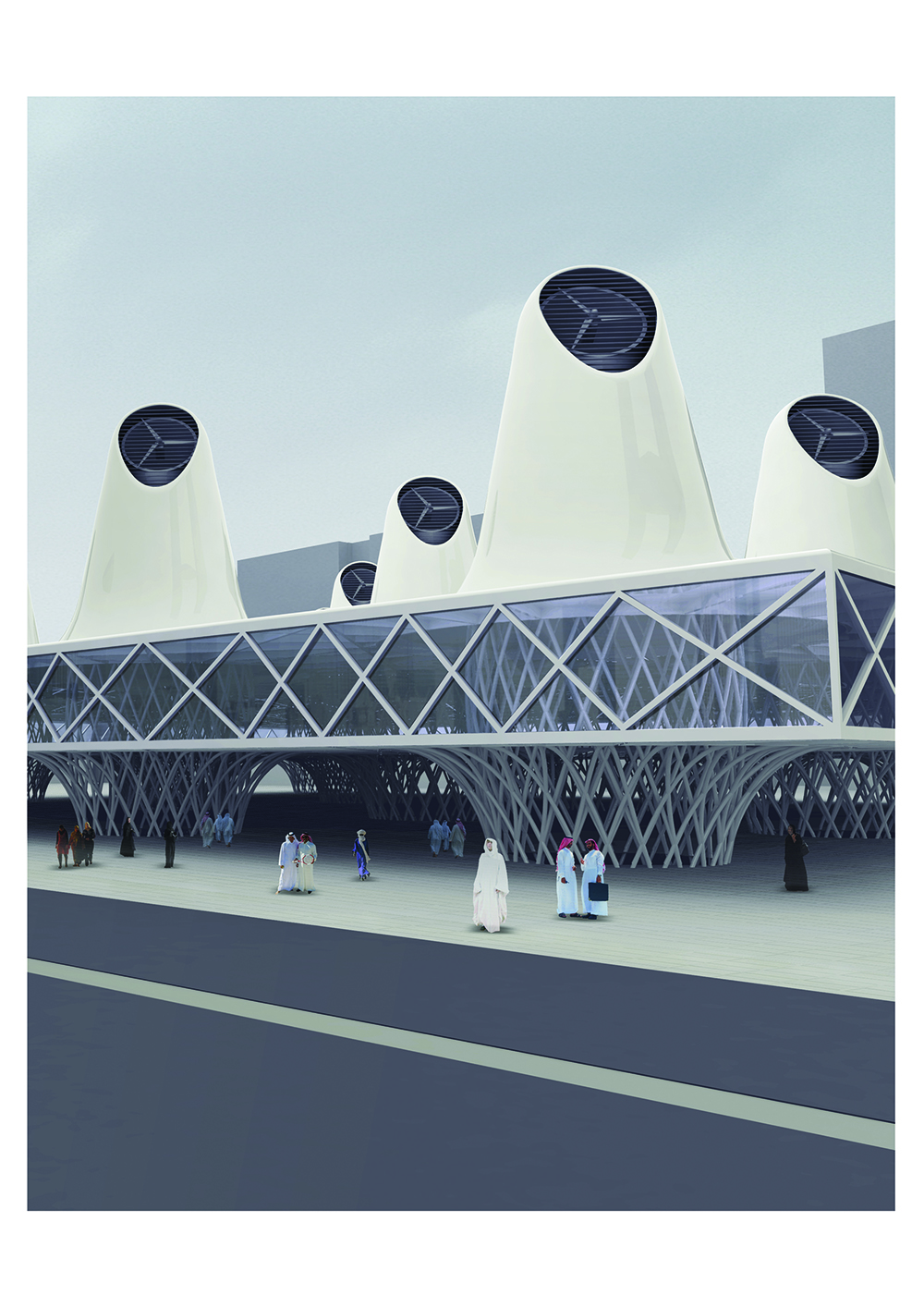 既有来自发展的内在变化也有来自西方影响的变化。风塔广场的概念是有选择的吸收西方影响地保持巴林的身份。 此外,许多重要的事情我们称为“西方的”但不是“西方的”而是“普遍的”。 风塔广场是一个新的战略,以更新阿拉伯的城市公共空间。旧的形成新的,设计的基本概念来自学习当地传统的风塔建筑。就像一个矩阵,16个巨大的柱子组成一个整体的建筑结构。一个城市的多功能体量是从地面升起,用于邮局,餐厅和休闲娱乐。地面层是步行路空间,地下两层用于停车场。作为捕风设施,柱子为整个建筑创造了一个气候交换系统。公共空间被定义为一个多维的日常生活舞台。每个人都可以参与,并为未来的本土文化做出贡献。巴林风塔广场代表着巴林的未来:可持续发展、尊重传统和向世界开放。