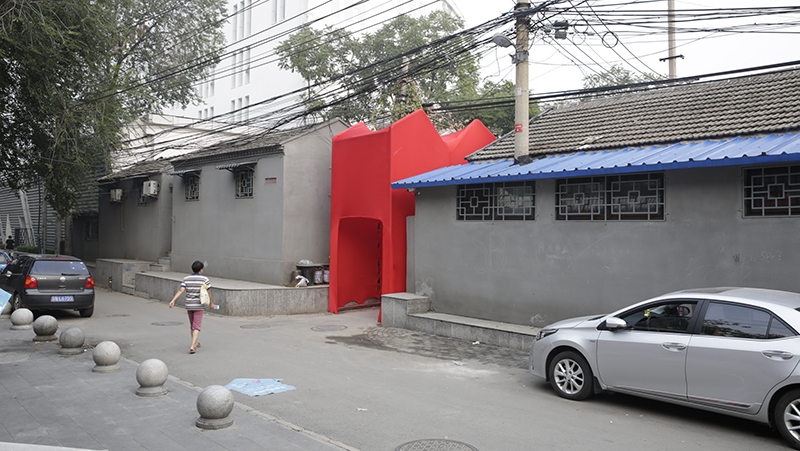 青龙胡同街区内的藏经馆胡同支路是一条死胡同,我们在这条胡同与藏经馆胡同的连接处设置一个象征性的出入口,既区隔了内向的胡同邻里空间与外向的公共空间,同时也强化了胡同内部空间的空间认同感。这种认同感将会逐步增强胡同邻里之间的交流与共同生活,人们渐渐会走出各自的房间在胡同中共同踢毽子、吃炸酱面。这个设计不需要很大的资金投入却激发了人们自主改善维护环境的热情。因此胡同在这里不再是印象而成为一种积极的生活方式。它在将死胡同——藏经馆支路重新恢复为街坊邻里的共同空间的同时,也让藏经馆胡同的主路充满了公共性特征。一组红色织物与钢架构成了这个环境建筑,它源于对这个空间的结构形态学分析及其“环境——程序”而非始于一个形状。其建筑形式是这一“环境——程序”的物化形式。随着2016年北京设计周的结束,红色织物被撤去,仅仅留下一个外表抽象的钢架,但是它产生的意义并未消失。这里的人们可以在各种事件中,重新将它妆点起来,例如在节日里挂上灯笼等。人们因着它而在城市公共空间偶遇,而在邻里内交往。