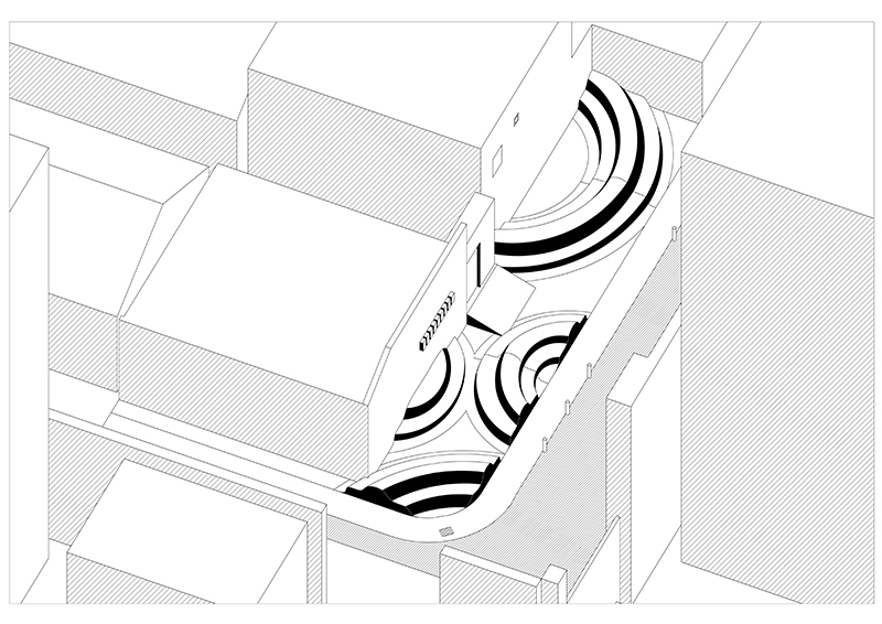 此位置,紧邻学校,并且是藏经馆胡同少有的公共开放空间。是白领,旅游者,接送上下学孩子的家长的聚集空间,也是本地居民的交往空间。 平面形态如同泉涌,因此这里也是一个感恩的地方,是政府回馈本地居民,提高生活质量,改善生活条件的空间。也是学生对家长与老师感恩的空间。滴水之恩,当涌泉相报。