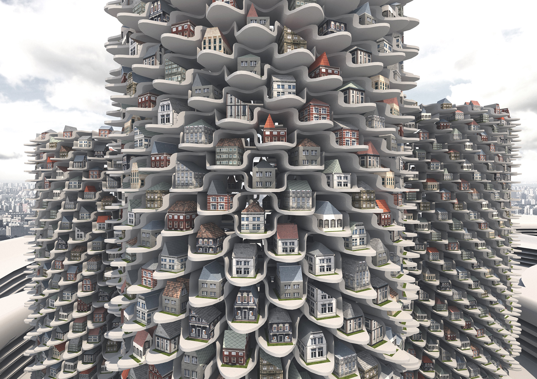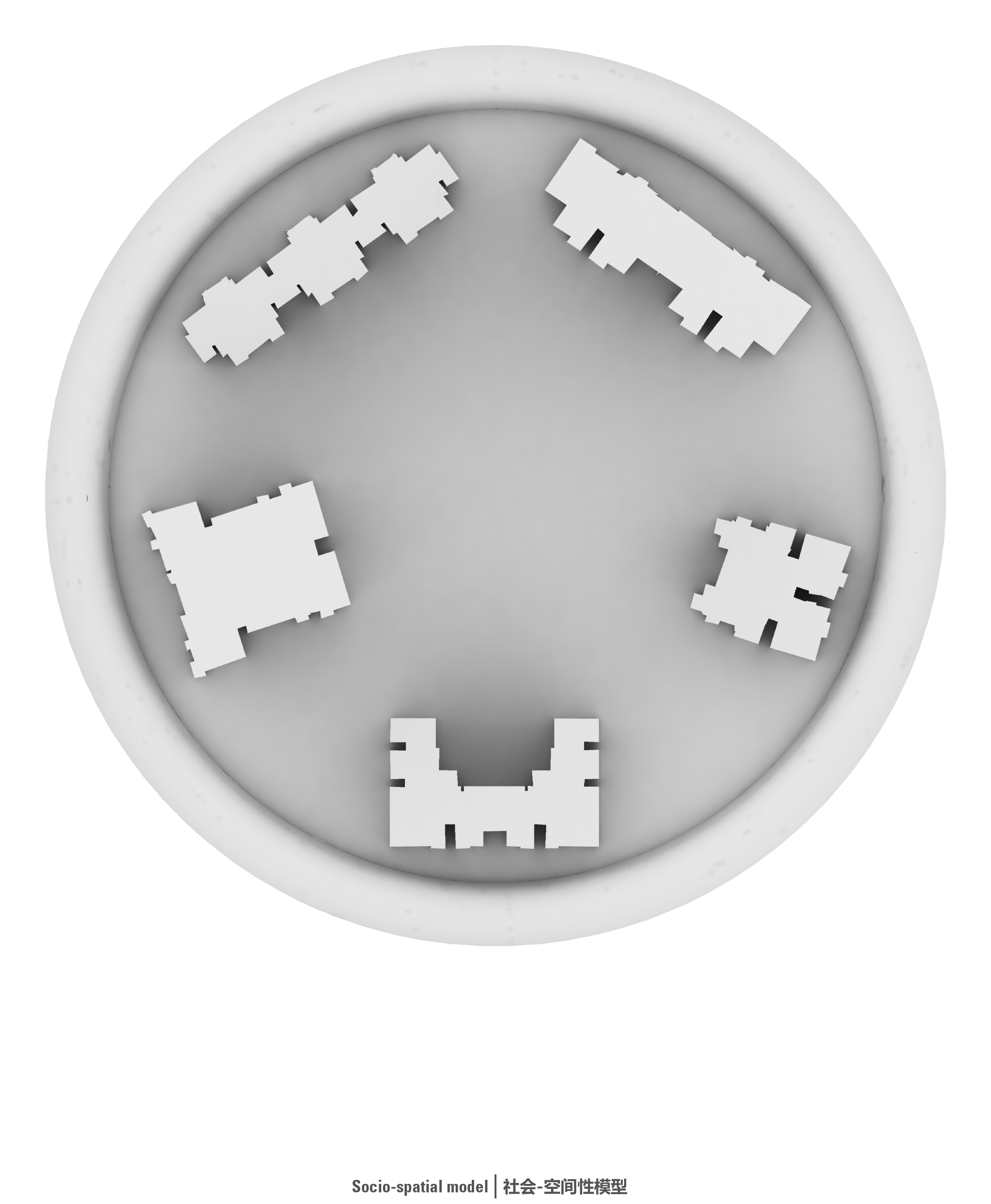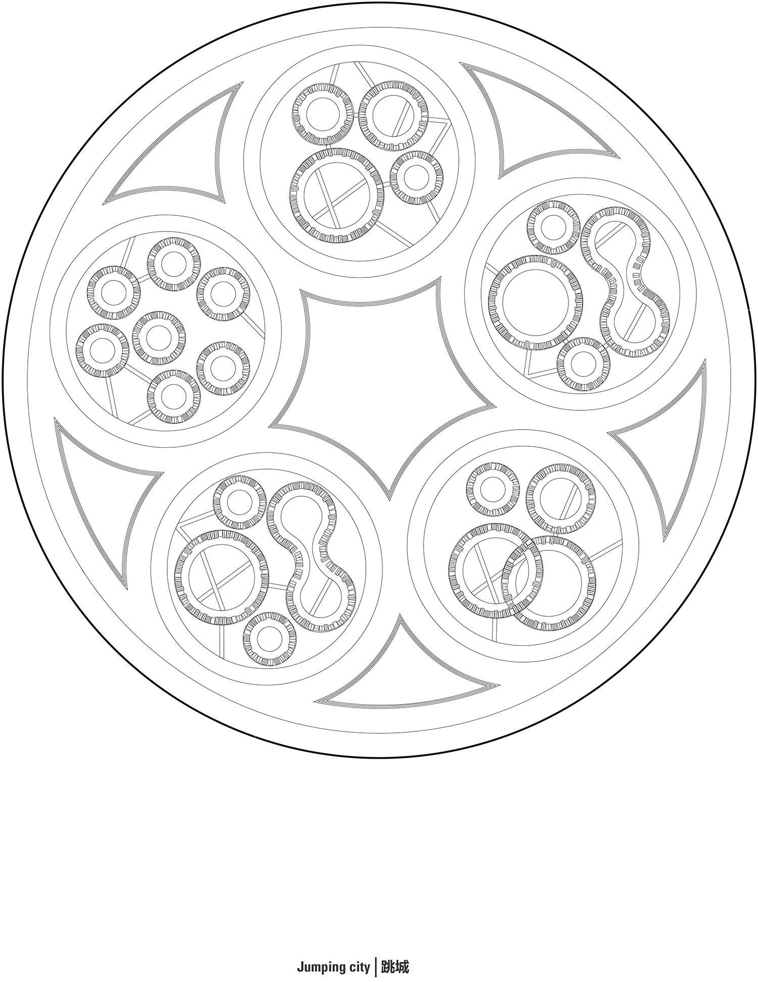 跳城,在严格按照中国现有城市社会空间结构与规范的前提下,提出了社区——建筑原型,以11户为一层的垂直花园邻里建筑。其中每一户的空间单元,在现有预制的基础设施的基础之上,自建可搬走的木板房。因此形成了在中国的土地市场与建筑不动产市场之外的全新的第三极——空间市场。使得个体消费者可以在政府,开发商之外形成新的可操作的市场行为。这一建筑将永久性与移动性分离,在遵循中国特有的土地经济政治中,形成了可持续性的发展策略。不仅是经济与社会上的可持续,也是生态与生存的可持续。