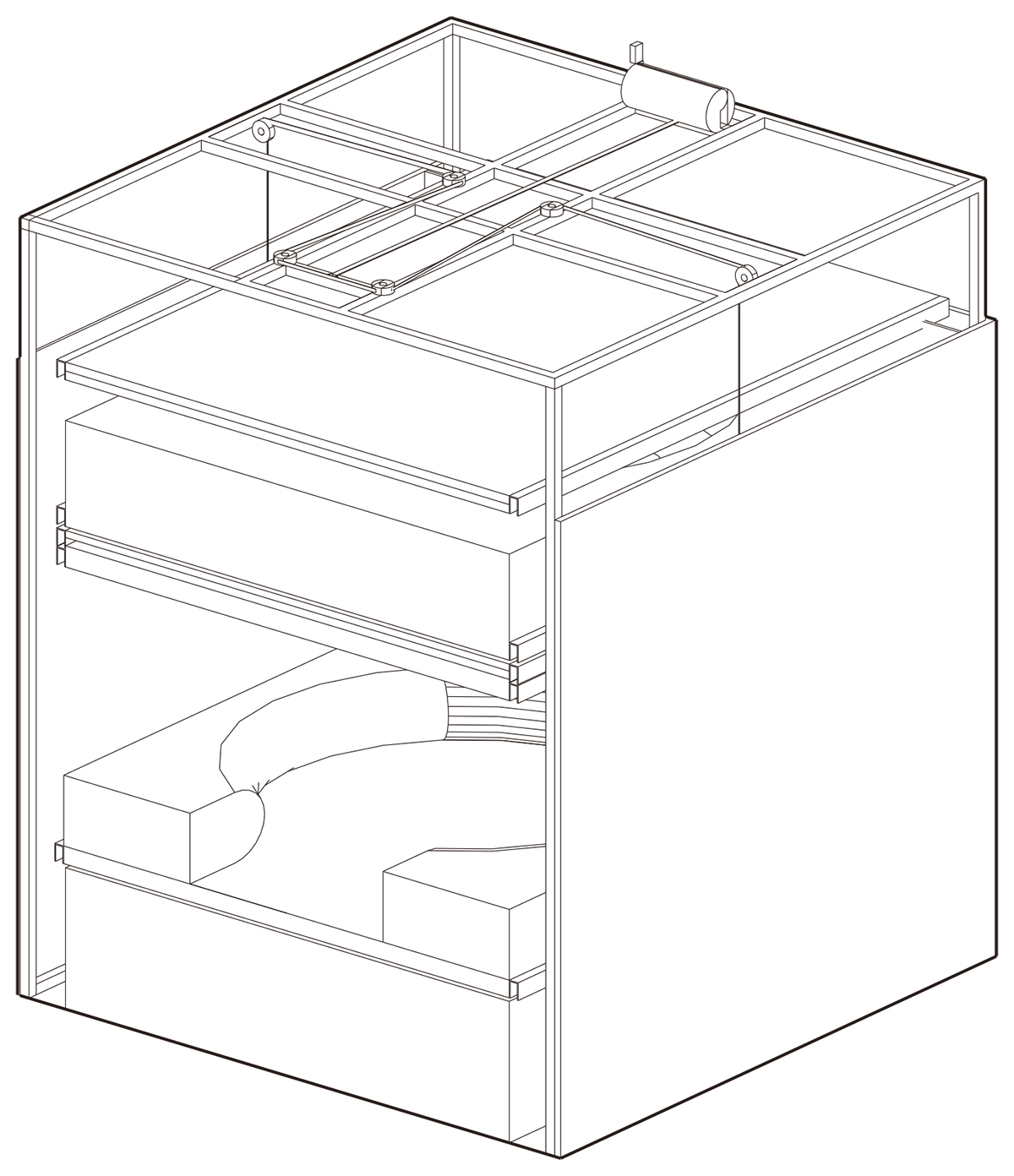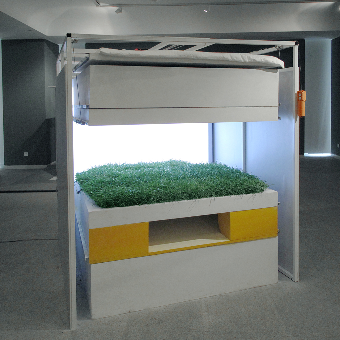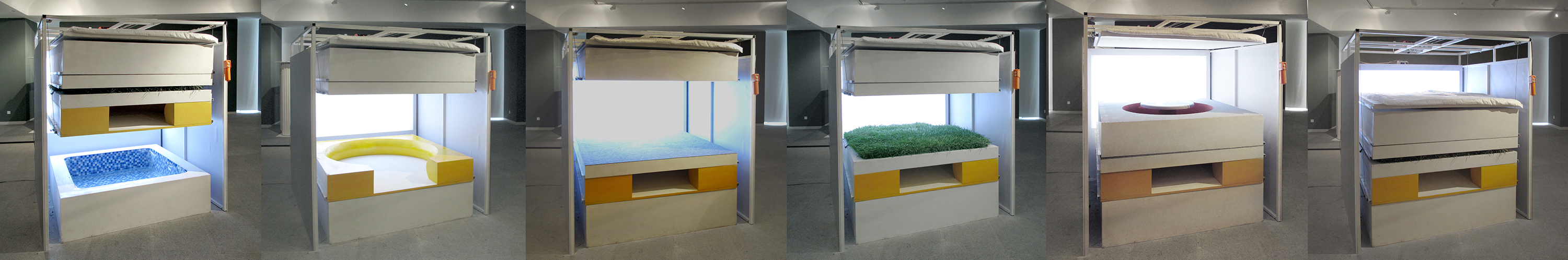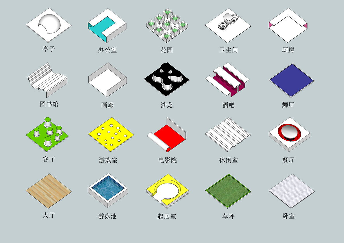 “极大单元”是专为<一间宅>展览所作的设计。这个设计是针对中国当前城市化发展的状况所作的特别研究为基础而提出的实验性方案。城市弱势群体的居住状况引发社会关注,例如香港笼屋(cagehome)。当前中国大城市房价飞涨,出现了“蜗居”的社会现象,甚至出现出租式的集装箱住宿。这些“蜗居者”中有许多是刚刚从大学毕业进入一线城市工作的白领阶层。中国式的高房价正在限制中国城市公民的流动性,从而在本质上降低社会经济发展的活力。为了缓解城市移民的居住压力和提高社会生活的流动性,如何能够在最低成本中,实现有保障的与个性化的生活质量成为这个方案形成的出发点。这个方案依据人的尺度,制定了最基本的空间尺寸: 1.82M×1.82M×1.82M的立方体。根据中国城市居住的主要形式――高层住宅,即在最小的用地中生产出最大的空间容量,“极大单元”采用了垂直的空间组织模式。类似于“一梯一户”的方式,将诸多居住生活的功能空间垂直的安排在这个立方体空间中,并形成了一个紧凑的类似于压缩饼干式的居住空间。它被称之为“极大单元”。 这个“极大单元”包括了两个主要的系统。一个被称之为“菜单系统”(Menu),另一个称之为“支持系统”(support System)。“菜单系统”是由一系列1.82M×1.82M的板状功能结构组成。每一个轻质板状结构根据功能设计,由一次性压模成型的高强度纸质纤维材料构成。经表面处理后形成一个功能性空间界面。这些工业化预制生产的轻质板状结构总体性的构成了“菜单系统”。像超市中的产品,消费者可以根据个人的实际需要购买其中的不同功能的产品并选择数量。“菜单系统”目前设计为20种不同功能,并在实际中可以无限扩充。其中包括:起居,卧室,草坪,游泳池,大厅,餐厅,卫生间,沙龙,游戏室,酒吧,厨房,办公等。无限扩充的功能产品使得这个最小尺度的单元获得了最大的功能可能性。使用者也因此获得了重要的空间质量,多样性被置于批量生产的空间产品之中。由此,这个系统被称之为“极大单元”。 “支持系统”是一套简单的电动机械装置,通过控制段可以选择不同的功能性空间界面,即菜单产品,在立方体空间中升降到使用位置,并将其它轻质板状结构叠压在一起,从而形成最紧凑的使用空间。在操作时,选择需要的功能,并将其以上的轻质板状结构升起,这样相互垂直叠压的板状结构从中分开,上面的作为天花,下面的形成基础。 1.82M×1.82M×1.82M的立方体是一个纯粹的空间商品。“极大单元”适应这个空间商品的特性,为一个人高空间提供了最大的多样性与生活质量。工业化生产与社会化供应相结合,每一个“极大单元”的成本降低到人民币3000元。其中“支持系统”1000元,“菜单系统”2000元。低成本使得“超单元”具有良好的适应性,为流动性的城市移民与“蜗居者”提供最大的生活质量。