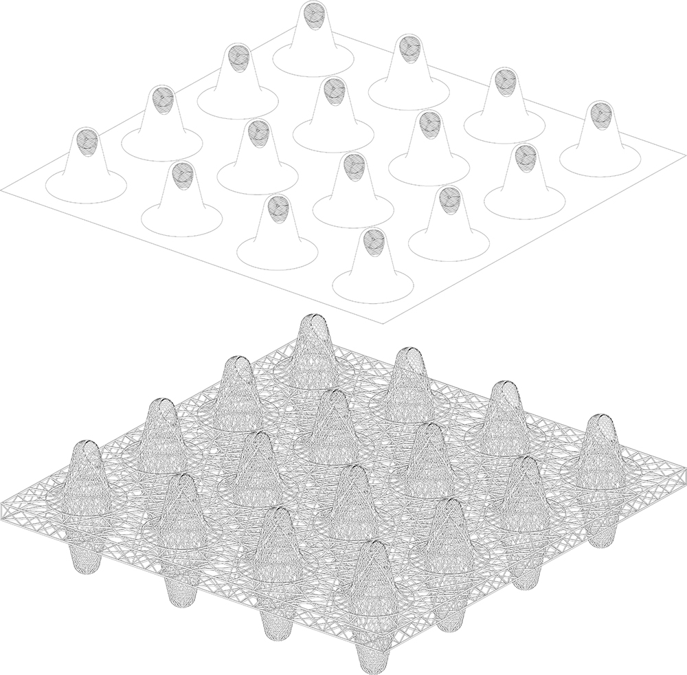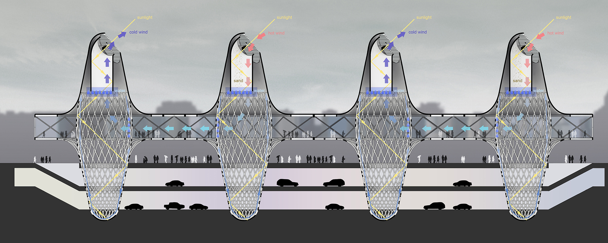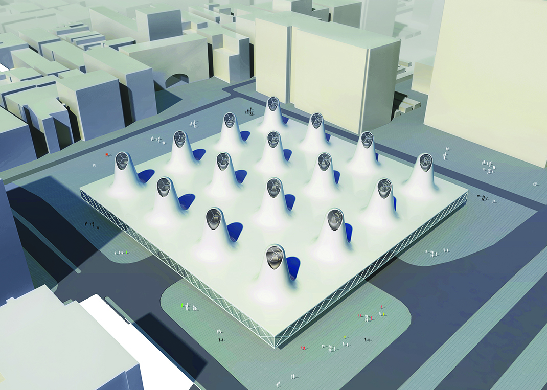 - There are endogenous changes from developments and changes coming from western influences. The conception of Wind Tower Square [WTS] keeps Bahrain’s identity – also by adapting some western influences. Besides: Many important things we call ‘western’ are not ‘western’ but ‘universal’. WTS is a new strategy to renew the Arabic urban public space. The old shapes the new, the basic conception for design comes from studying the local traditional wind tower architecture. Like a matrix, 16 huge columns compose a whole building structure. An urban multifunctional volume is rising from the ground. The rising functional volume is used for post office, Cafe and recreations. The ground is open for pedestrian, 2 underground floors are for parking. As wind catchers, the columns create a climate exchange system for the whole construction. The public space is defined as a multi-dimensional daily life stage. Everyone can participate and contribute the local culture for future. WTS present the future of Bahrain: sustainable development, respect to traditions and open to the world.