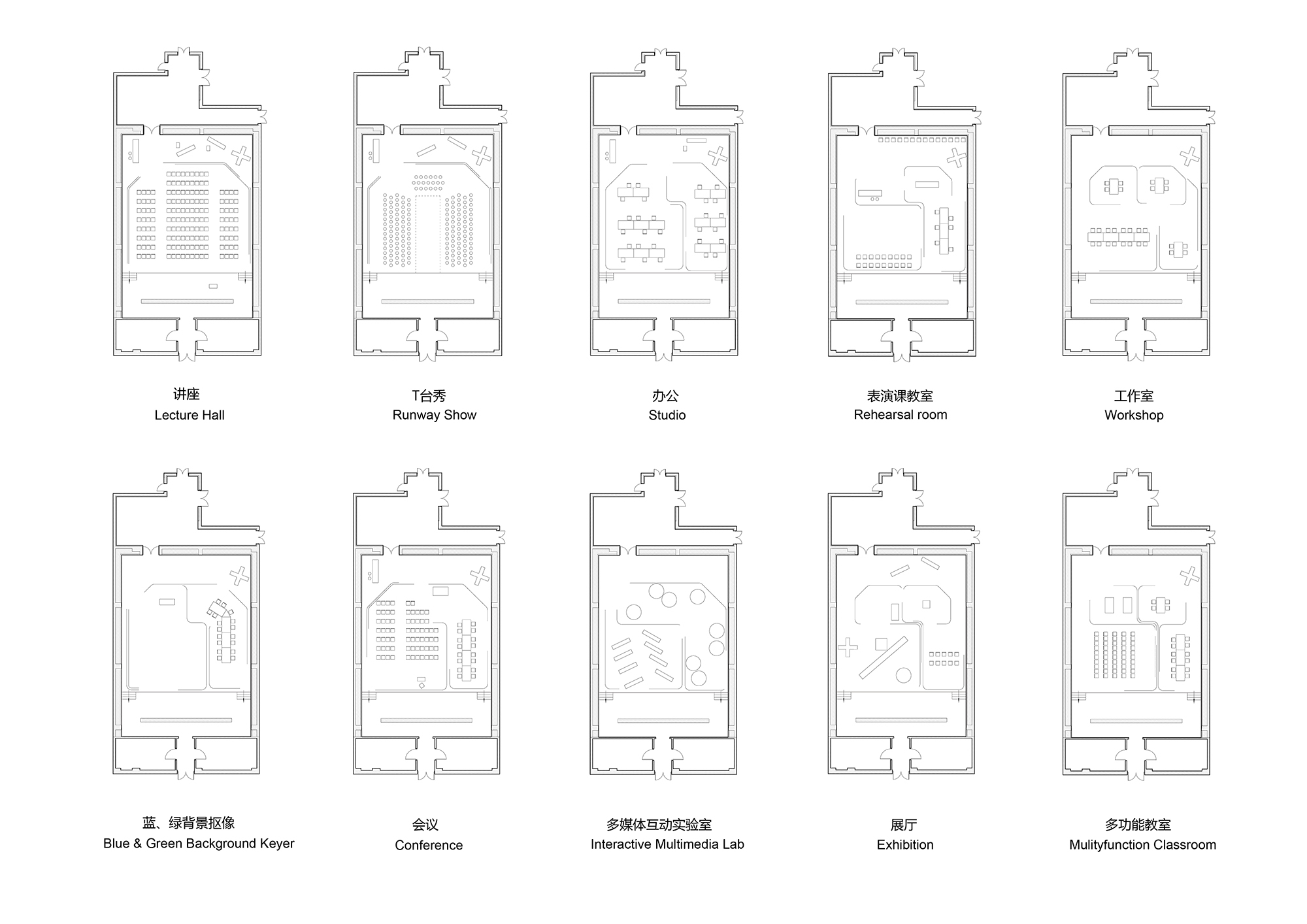 China Program: Lecture Hall, Runway show, small theatre, Motion capture and photography lab, workshop and exhibition etc.