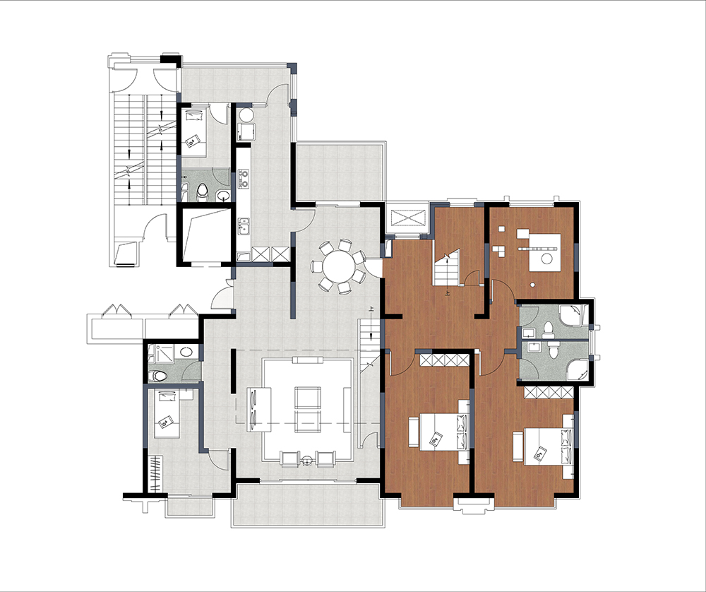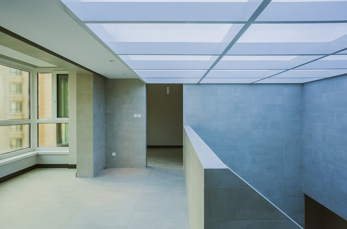 Z House is located in an ordinary high-rise residential building. The owner has two apartments next to each other in different floor. According to the owner's request, the two apartments will form one apartment with communication spaces and living spaces. In this design, we convert the two apartments on different floors from a spatial relationship of parallel to each other into a spatial relationship that overlaps vertically. The apartment still retains two entrances and exits, one on the lower floor connecting the outward space and one on the upper floor connecting the inward space. In order to realize the transformation of spatial character, we designed a two-story patio space in the living room of the outward space, and a luminous ceiling that simulates the skylight. An uncharacteristic apartment was transformed into a courtyard. The ingenious streamline design allows the inward and outward spaces to be tightly integrated through two sets of stairs, and the two apartments become one.